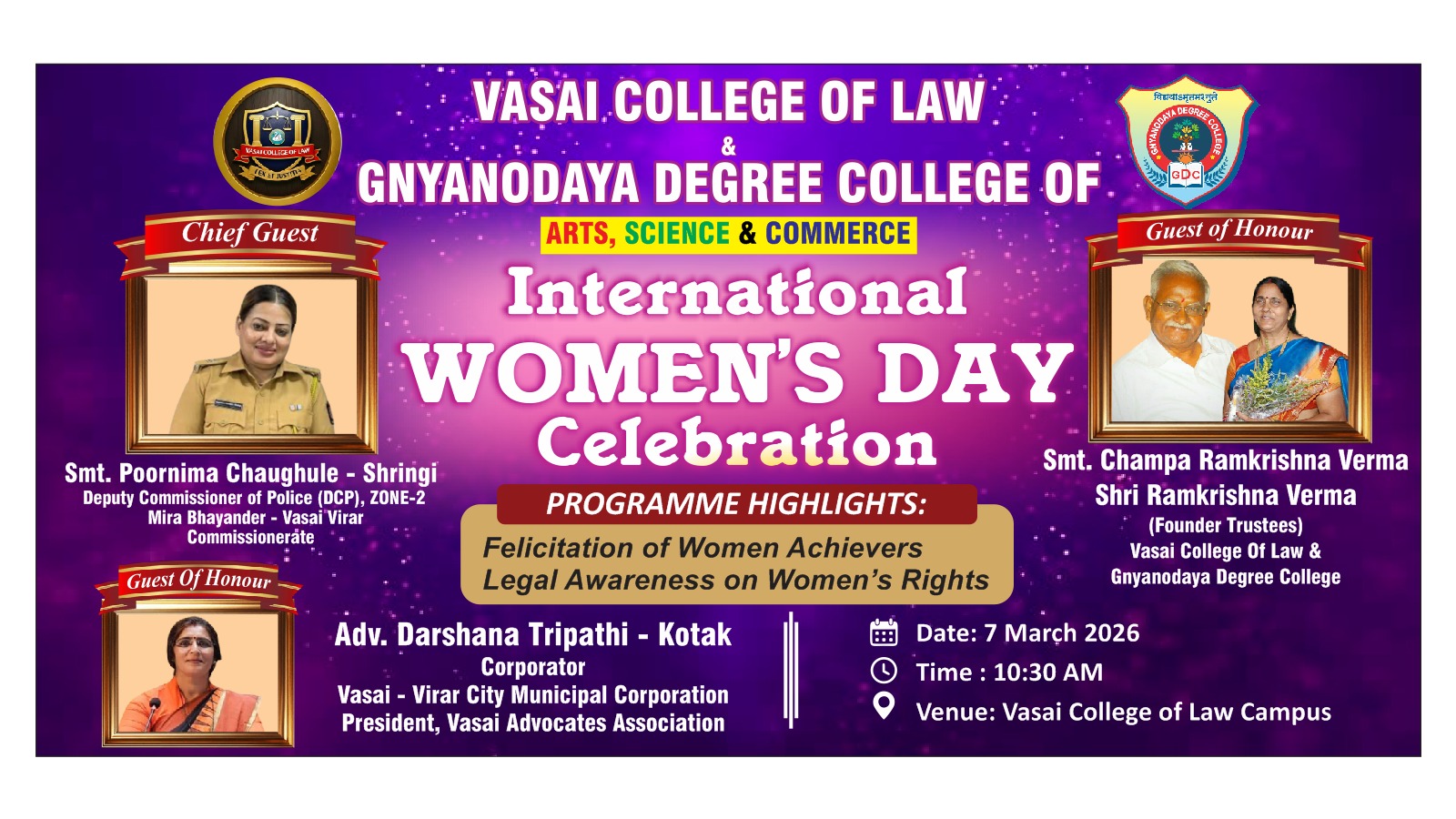 Vasai College of Law was established in the year 2024. It is affiliated to University of Mumbai, registered with Bar Council of India, New Delhi and recognized by Government of Maharashtra. We offer LL.B. (3 years) Course. It is to kindle the spirit of learning among the youth, irrespective of socioeconomic differences, to consistently pursue excellence preserving the tradition of high reputation while meeting the challenges of the globalized world. It is to provide quality and affordable education to all the sections of society by giving Equal Opportunities for Education Holistic Education ensuring all-round development of students. Create a human capital, which can be an asset to the nation, to encourage the spirit of research .……